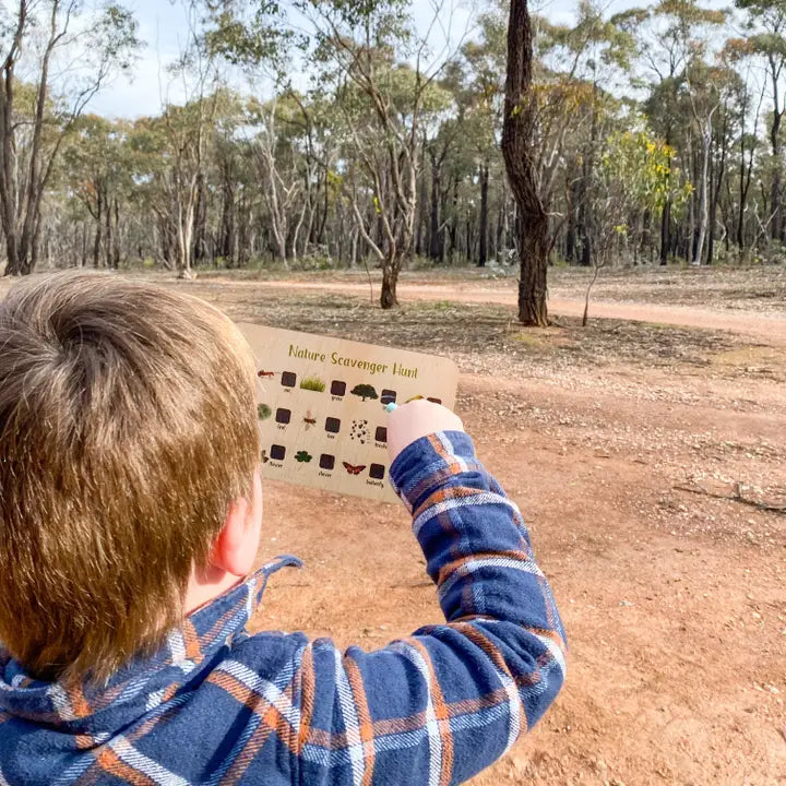 Our reusable Nature Scavenger Hunt Board invites kids to explore, discover and connect with the world around them. Crafted from durable printed wood and measuring 23cm x 15cm, each board features 12 nature-inspired finds — including an ant, leaf, flower, grass, bee, clover, tree, tracks, butterfly, bird, water and web.