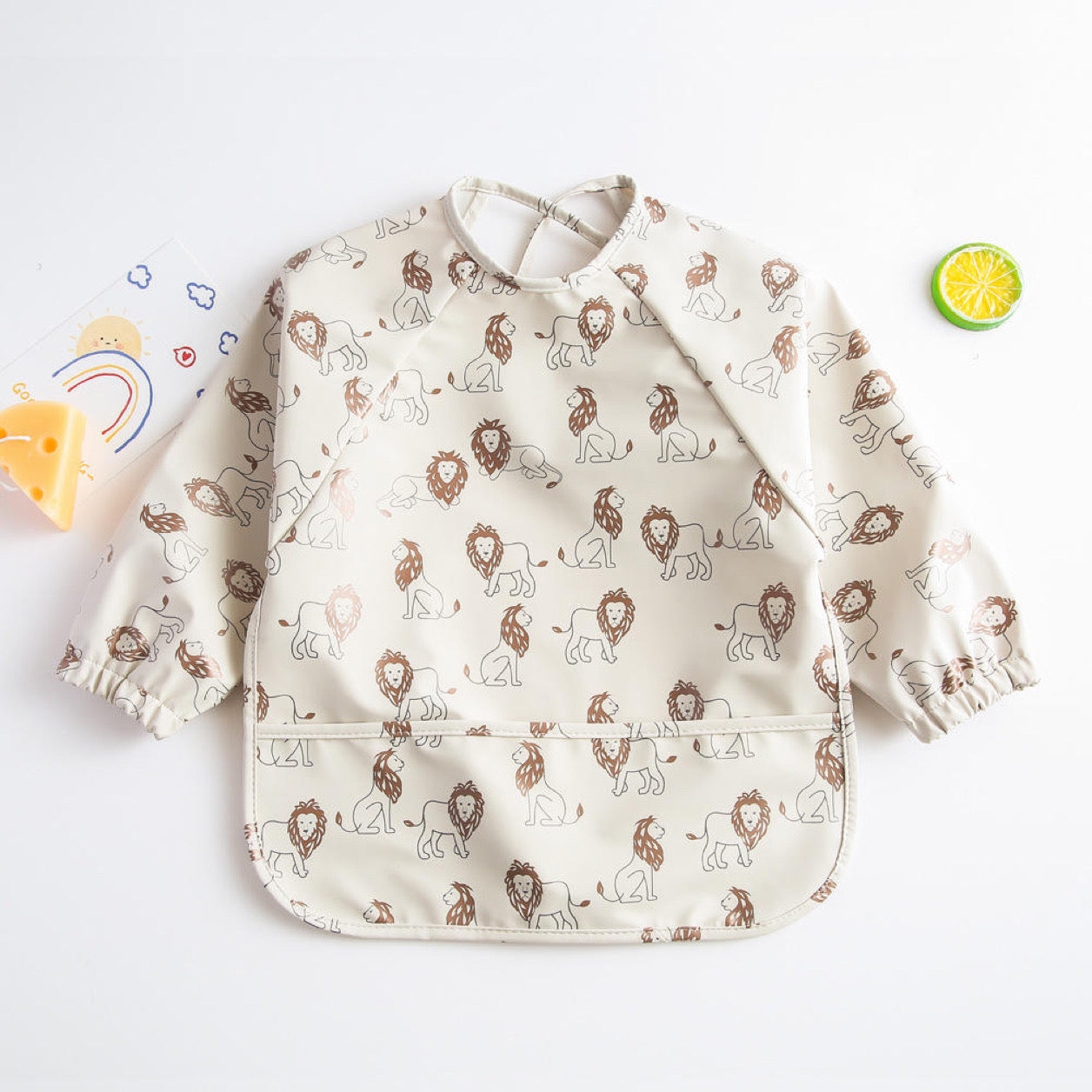 Featuring a large pocket at the front designed to catch food, our smock bib ties at the closure at the nape of neck as well as the back and has long sleeves with elastic cuffs.
